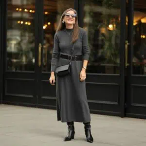 Layering is not just about keeping warm; it’s a chance to express your personal style while creating a cohesive outfit. Boxy fleece layers have become a staple for their versatility and comfort. The soft gray hues used here harmonize beautifully with the black turtleneck, providing both depth and warmth without overwhelming the frame. The relaxed-fit charcoal trousers maintain an effortlessly chic vibe. Pairing this ensemble with stylish ankle boots adds height and polish, while gold minimal jewelry and a structured handbag introduce elegance without being fussy. Oversized sunglasses provide that perfect touch of cool, ensuring the outfit looks modern and fresh.