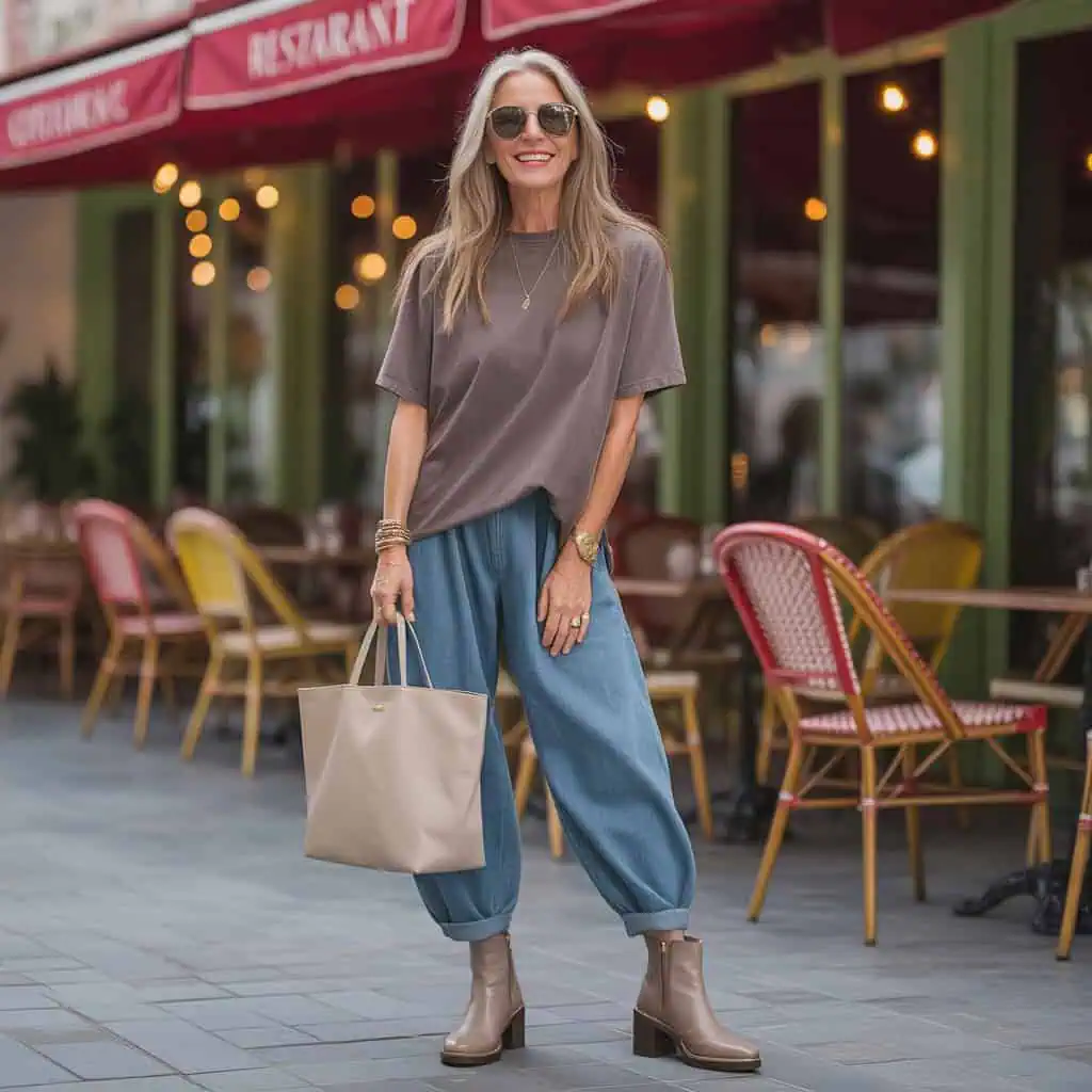 Coordinated top-and-bottom sets are all the rage for good reason—they offer a streamlined appearance while allowing for playful pattern or color combinations. A muted green ensemble, featuring a long top and wide-leg pants, exudes a relaxed elegance that flatters without sacrificing comfort. This cut not only provides ample room for movement but also brings a touch of contemporary flair. Pairing this with tan leather ankle boots grounds the outfit nicely, while chic accessories like a crossbody bag and sunglasses elevate the look, making it perfect for brunch or a leisurely shopping spree.