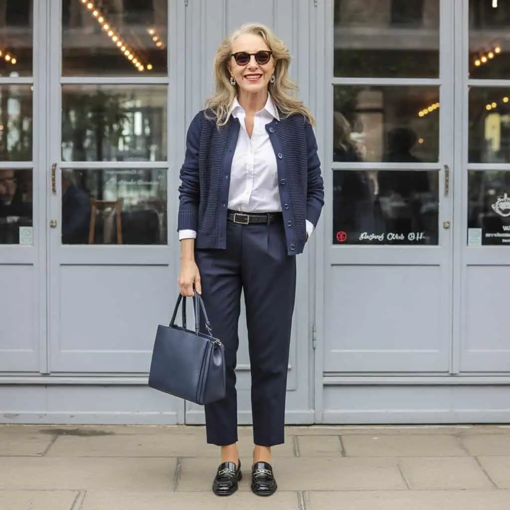 The idea of matching every piece of an outfit often feels constricting, but this look perfectly demonstrates the magic of mixing while maintaining a cohesive aesthetic. The navy paired with a white creates a timeless base that serves as a canvas for the dark cardigan adding a gentle pop of color without overwhelming the outfit. This laid-back ensemble is enhanced with loafers, ensuring comfort without compromising style. The playful layering offers both depth and visual interest, while the subtle accessories, such as dainty jewelry and a chic clutch, tie everything together without competing for attention. Embracing a relaxed approach to color coordination showcases confidence and sophistication, proving that variety can enhance rather than clash. So go ahead and play with your pieces—stylish versatility is always in season!