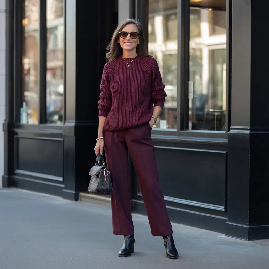 The beauty of dressing any age lies in the clever use of color, and this ensemble takes a refreshing twist on the notion of sticking solely to dark shades. Featuring a burgundy sweater that softens the overall stance, it offers warmth and playfulness while embracing relaxed denim that provides comfort. Not only does it look good, but it beautifully contrasts with black ankle boots, ensuring a cohesive aesthetic. This outfit wonderfully illustrates that layers and textures can make color work at any age, turning a potentially bland palette into an inviting celebration of style.