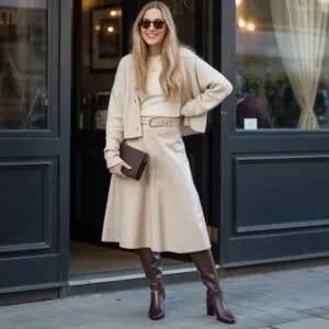 Opting for a simple black turtleneck alongside a heavily embellished pencil skirt is a powerful statement showcasing how merging timeless elements with trendy pieces can be effortlessly chic, regardless of age. The subdued top serves as a perfect canvas, letting the intricate details of the skirt shine. Black kitten heels are an effortlessly stylish choice, offering both comfort and elegance. By balancing classic staples with a touch of contemporary glam, this look demonstrates that it’s entirely possible to embrace trends selectively, proving that being stylish after 60 is not about rigid adherence to rules but instead about expressing one’s unique flair.