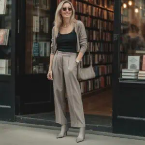 Embracing sleeveless tops at any age is a vibrant expression of confidence and style. A cherry red tank paired with high-waisted beige trousers creates a stunning color contrast, drawing attention to the face and allowing the wearer to highlight her beautiful skin and smile. The high-waisted trousers elongate the legs, providing balance while the low block-heel boots add comfort without sacrificing style. The oversized sunglasses and statement jewelry round out the look, creating a perfect blend of sophistication and fun. This outfit showcases that age doesn’t dictate your wardrobe – confidence does!