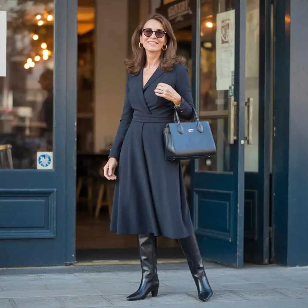 The adage of dressing “your age” can often box women into a corner. A long-sleeve wrap dress in a rich olive tone beautifully fuses maturity with modernity. The subtle waist tie flatters the figure while exuding a sense of effortless charm. By layering this with black heeled ankle boots, you elevate the whole outfit—sheer comfort combined with a little lift. Cat-eye sunglasses introduce a playful nod to vintage fashion trends, while a textured crossbody bag brings in an element of interest. Layering delicate gold necklaces adds depth, proving that embracing your style at any age is an empowering choice that celebrates individual beauty.
