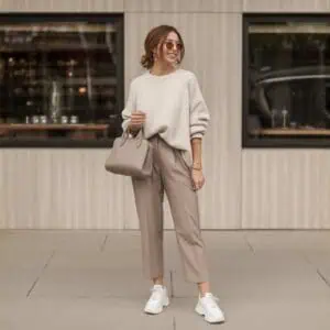 A cozy knit sweater paired with high-waisted straight trousers is a timeless French girl formula that flatters a mature silhouette beautifully. The softness of the knit brings warmth and comfort, while the structure of the straight trousers creates a balanced outline, elongating the leg line. Tucking the sweater into the waistband emphasizes the waist, adding shape without sacrificing comfort. To elevate this look, accessorizing with gold hoop earrings and a delicate necklace introduces a touch of sophistication. Together, these elements create a chic and accessible vibe that encapsulates effortless style, perfect for any age.