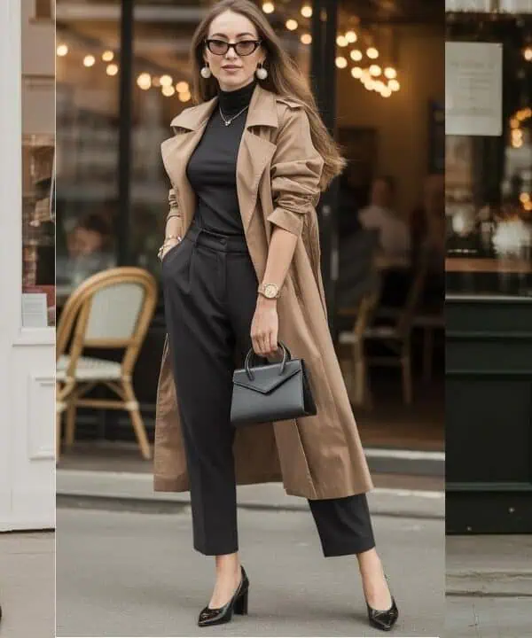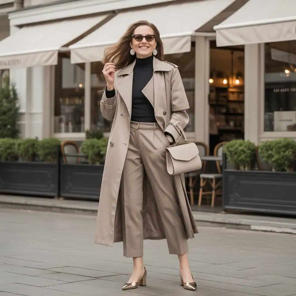 Timeless and effortlessly chic, the classic trench coat is a wardrobe staple that transcends generations. Its versatile nature pairs beautifully with various outfits, instantly elevating your look. The beige shade complements a black turtleneck and tailored trousers, creating a sophisticated contrast that’s easy on the eyes. Accessories like pearl studs and cat-eye sunglasses add a touch of glamour, while block-heeled pumps provide both comfort and elegance. The cinched waist gives a flattering silhouette, making it perfect for brunch or a casual outing with friends. This silhouette is flattering and accentuates your shape gracefully, embodying both confidence and style.