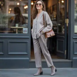 A belted navy wool coat instantly lends an air of sophistication, making it a go-to piece for both work and leisure. Its structured silhouette complements tailored trousers, which offer a polished alternative to jeans without sacrificing comfort. Layering a light grey sweater adds a soft touch, creating an appealing contrast to the darker coat. Black heeled loafers not only provide comfort but also enhance the outfit’s chicness. With square sunglasses and a structured grey handbag, the look becomes effortlessly refined, proving that age is irrelevant in the pursuit of classic style. This collaboration of pieces showcases the beauty of sophisticated layering.