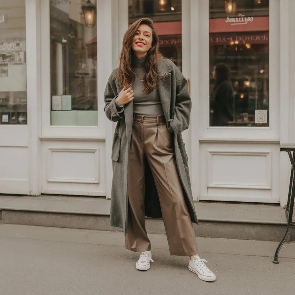 There’s something effortlessly chic about pairing an oversized gray coat with wide-leg trousers and sneakers. This combination strikes the perfect balance between comfort and style. The oversized coat adds a cozy, relaxed vibe while framing the silhouette beautifully—it’s all about making a statement without sacrificing functionality. The fitted turtleneck beneath subtly defines your shape and creates a polished contrast against the flowing trousers, which add an air of sophistication. By choosing white canvas sneakers, you introduce a fresh element that keeps the look grounded and approachable. This outfit becomes a versatile choice, seamlessly transitioning from casual outings to more curated events, all while allowing you to showcase your unique style with confidence.