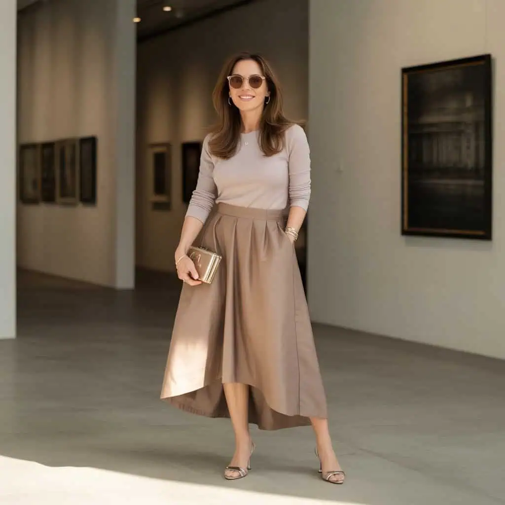 Avoiding boxy shapeless silhouettes is key to achieving a flattering look that accentuates your natural shape. Instead, an elegantly tailored midi skirt that cinches the waist creates a harmonious silhouette while instantly chicifying your outfit. When paired with a fitted top, this combination not only elongates the frame but also provides a sophisticated touch without compromising on comfort. Sneakers inject a youthful vibe, making the outfit appropriate for a variety of occasions. This layout encourages women over 50 to embrace their individuality while making a stylish statement, proving that tailored pieces can masterfully blend timeless elegance with modern flair.
