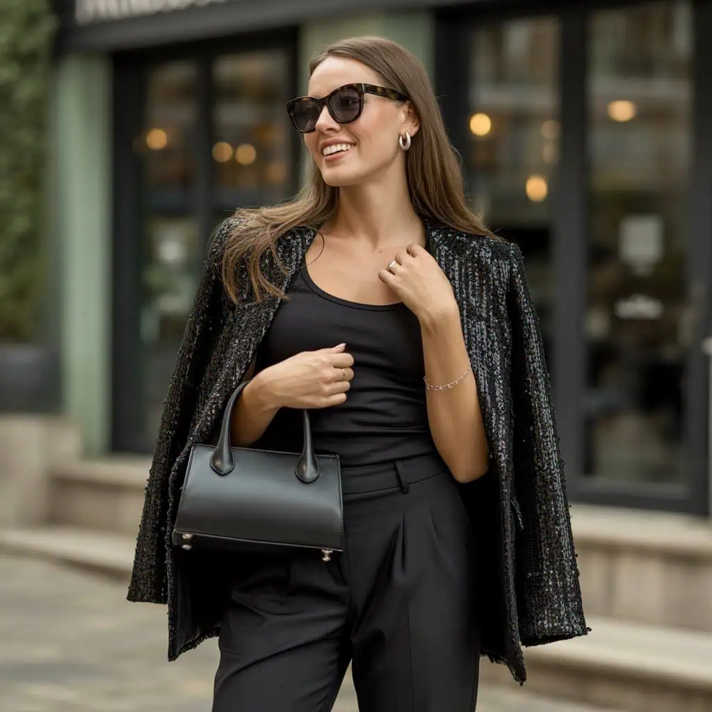 The sequin blazer strikes the ideal balance between statement piece and timeless classic. It’s all about balance; pairing this shimmering standout with a simple black tank and tailored trousers grounds the look, allowing the blazer to shine without overwhelming it. The tailored silhouette emphasizes structure, ensuring you exude sophistication. Opt for mid-heel ankle boots to elongate your legs while keeping the outfit refined, and the sleek black handbag adds a sleek finish. To elevate the entire ensemble, minimalist accessories like silver studs and a slim bracelet make it uncomplicated yet chic. This outfit proves that sparkle can be stylishly understated.