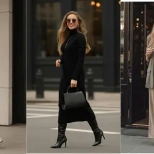 A well-structured blazer can instantly elevate an outfit, providing both polish and personality. Layering it over a fitted turtleneck introduces a sleek and sophisticated layer, perfect for cooler days. High-waisted trousers not only elongate the legs but also cinch the waist, giving a flattering figure while ensuring comfort. Heeled loafers maintain that sophisticated vibe while allowing ease of movement, essential for a busy lifestyle. This look’s striking balance of sharp tailoring and soft fabrics creates a harmonious ensemble suitable for various occasions, from brunch dates to gallery openings – a true testament to the idea that great style is ageless.