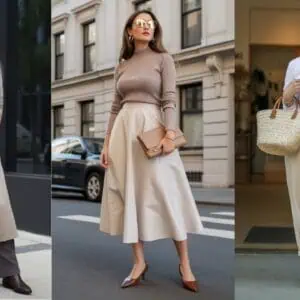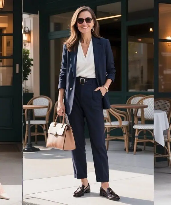 Structured silhouettes are essential for achieving that elevated appearance that screams sophistication. By combining a fitted fine-gauge turtleneck with a tailored blazer, the proportions create an elegant frame that flatters the figure. Straight-leg khaki trousers add a contemporary twist while maintaining a polished profile. Accessories like cream pointed-toe heels and a structured tan handbag further enhance the outfit’s strong lines, projecting confidence and professionalism. Details like pearl earrings add just the right amount of softness, making this combination perfect for conveying both style and authority. A well-structured outfit turns heads without even trying.