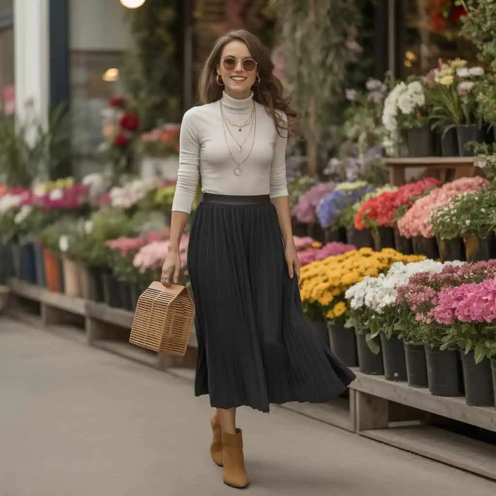 Sleek and effortlessly chic, a soft fitted turtleneck is a perfect alternative to boxy knits, embracing the body’s natural shape without clinging too tightly. The soft cream hue beautifully complements while the skirt enhances the silhouette by accentuating the waist and elongating the legs. Add some neutral accessories—like structured handbags and minimal jewelry—to maintain an air of refined elegance. This combination not only radiates sophistication but also allows for versatility; whether you pair it with loafers for a polished look or sneakers for a casual outing, you’ll feel both stylish and comfortable.