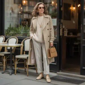 Proportion matters more with age, and mismatched lengths can easily throw off an outfit. When a long shirt or tunic hangs out beneath a shorter jacket, it visually cuts the body in awkward places. This disrupts vertical lines and can unintentionally shorten the torso or legs. Many women do this for comfort, but a more polished approach is to align your layers intentionally. Either choose a shorter top under a shorter jacket, or pair longer tops with longer outer layers like trenches or dusters. The goal is to create clean, uninterrupted lines that elongate your frame beautifully.