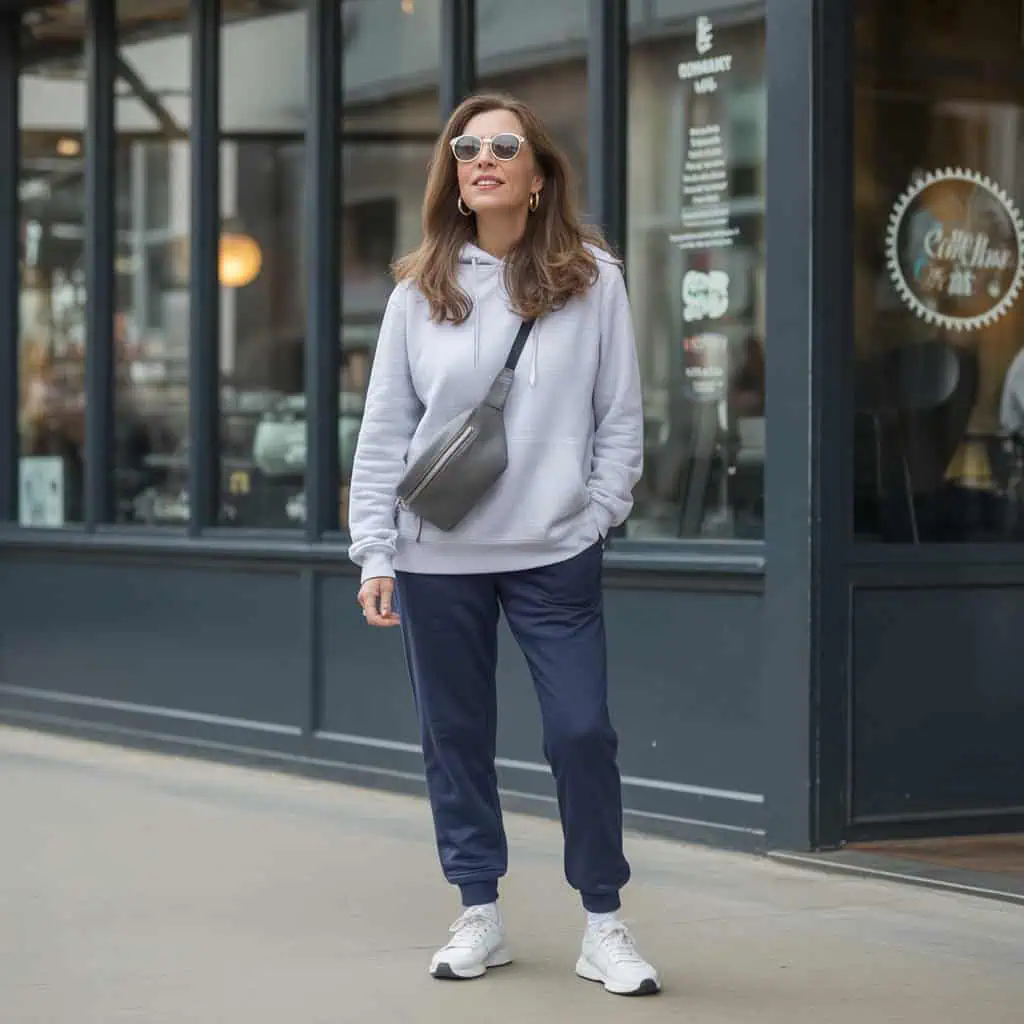 Transforming the classic hoodie into a fashion-forward statement is easily achieved by choosing tailored joggers that exude elegance. This combination allows for a relaxed vibe without sacrificing style, making it practical for weekend escapades. The soft texture of the hoodie invites comfort, while the structured fit of the joggers enhances your silhouette, showcasing a modern, polished look. Teaming the outfit with sleek black ankle boots creates a stylish contrast, providing a chic touch while maintaining versatility. Adding gray-tinted sunglasses and a charcoal crossbody bag elevates this sporty ensemble, ensuring you feel both comfortable and effortlessly put-together for any outing.