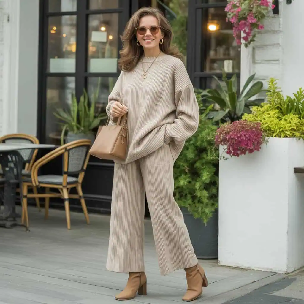 A matching knit set is the epitome of chic comfort, and swapping out traditional sneakers for boots amplifies its versatility. The cream-colored tone of the knit top and skirt intertwines sophistication with an inviting flair, perfect for weekend wear. The softness of the knit fabric feels gentle against your skin while providing structure, creating a refined look. By opting for boots, especially in a complementary color, the ensemble gains a fashionable edge that can take you from day to evening effortlessly. A structured handbag and soft gold earrings introduce a refined chicness, allowing you to express your personal style eloquently while staying cozy—exactly what the weekend calls for!