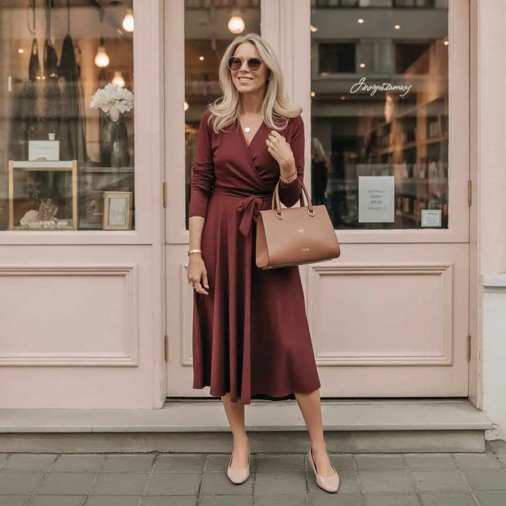 The wrap dress remains a classic style, especially for those looking to balance comfort and sophistication. Its adjustable design means it fits a variety of figures snugly while still allowing for movement, making it a perfect choice for a day of socializing. The rich burgundy tone adds depth and warmth, particularly appealing in various settings, from casual outings to more polished events. Complementing this stylish wrap with elegant nude ballet flats ensures you maintain ease of wear without sacrificing style. Pair it with subtle jewelry and a structured handbag for an effortlessly chic approach that exudes confidence and grace, perfect for women gracefully embracing their 50s.