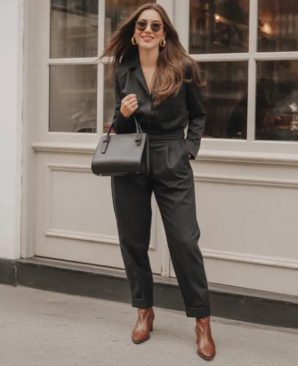 Opting for a wool cardigan layered over tailored trousers offers a refined yet cozy ensemble that’s ideal for the season. The mustard hue of the cardigan injects warmth into your outfit, complemented beautifully by the taupe trousers for a harmonious color palette. Tucking in the cardigan enhances your proportions and elevates the look from merely comfy to stylishly put-together. Beige ballet flats introduce a touch of grace and ease, ideal for fall outings. Accessorizing with an elegant leather shoulder bag and aviator sunglasses gives the outfit a contemporary edge, while subtle stud earrings contribute a quiet sophistication. This blend of comfort and modern tailoring seamlessly captures the spirit of the season.