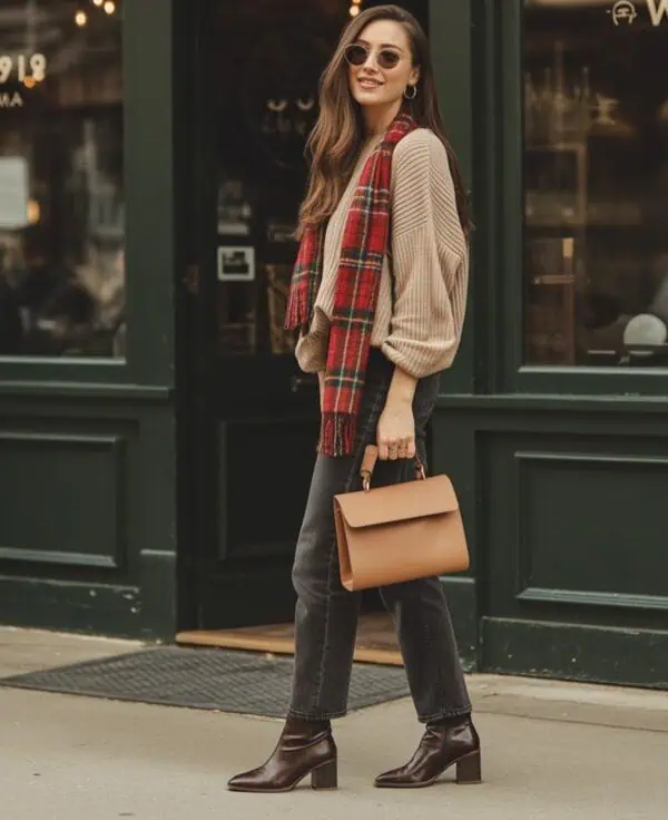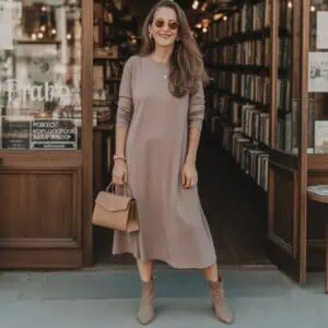 Opting for a knit dress paired with tall boots strikes a beautiful balance between comfort and sophistication, making it perfect for an evening outing. The soft texture of the knit brings warmth while celebrating the figure with its fitted silhouette. By teaming it with taupe heeled ankle boots, you elevate the look, adding height and grace to your frame. The elegance continues with dainty gold jewelry, which adds a touch of sparkle without overwhelming the outfit. Oversized sunglasses can effortlessly transition the day-to-night vibe, and a tan leather crossbody bag combines practicality with a touch of chicness. This combination exudes effortless style, ensuring you feel both comfortable and sophisticated as you enjoy the night.