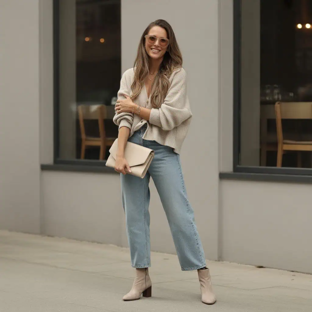 Layering in neutral tones is a timeless fashion strategy that exudes effortless sophistication. Combining a cream turtleneck with a light gray oversized cardigan creates depth while maintaining a cohesive palette. The wide-leg beige trousers contribute further to the relaxed vibe, allowing for fluidity and comfort. This look is perfect for transitioning between seasons, as it offers warmth without the bulk. To elevate the ensemble, the chic suede block-heel ankle boots provide a touch of elegance, and the structured cream clutch adds a stylish polish. Minimalist gold jewelry and oversized sunglasses enhance the overall chicness, making it an ideal choice for any casual gathering or daytime outing.