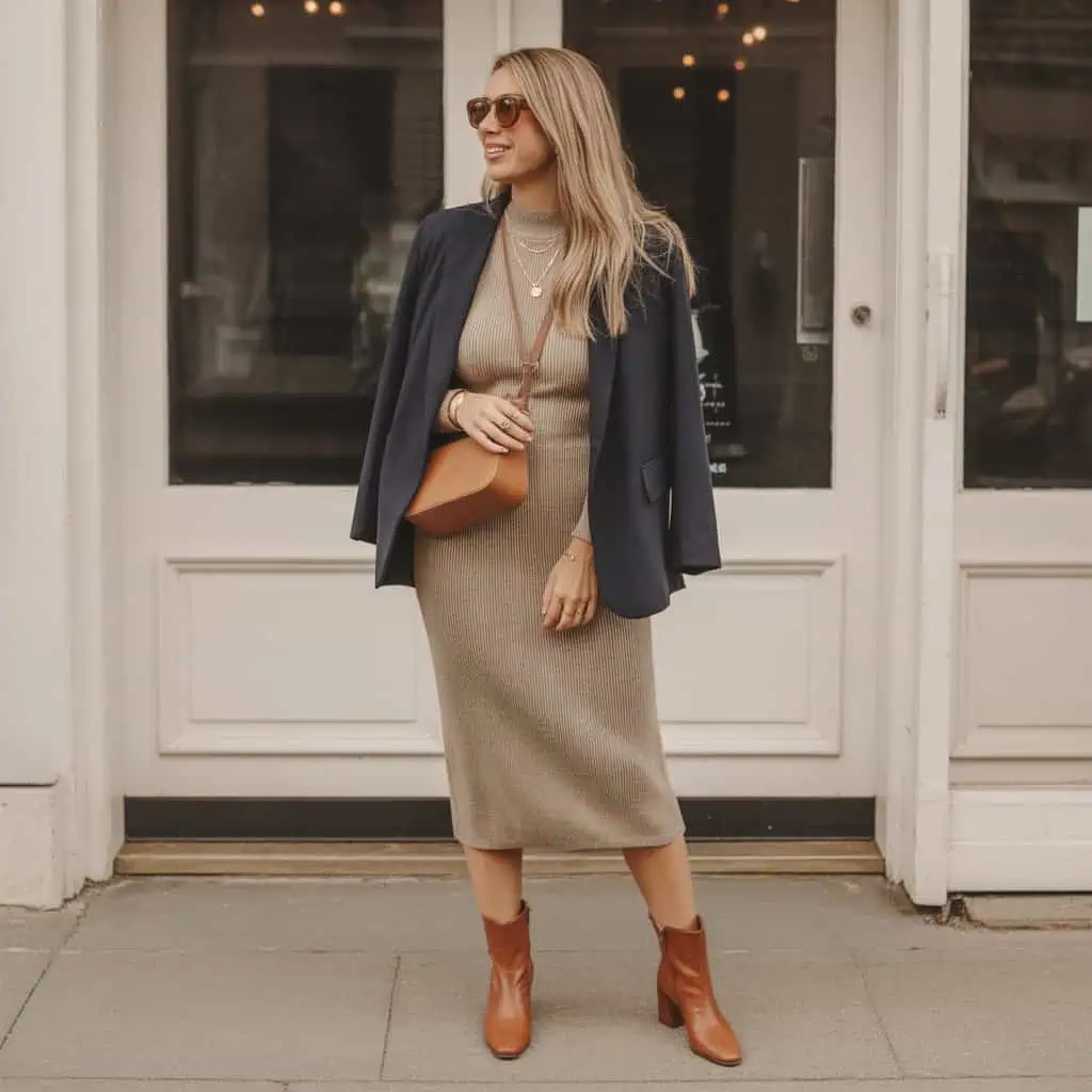 Layering a blazer over a fitted knit dress creates an effortlessly chic look that balances comfort and style perfectly. The added texture adds visual interest, while the fitted silhouette of the dress keeps the outfit polished and flattering. This combination invites versatility; you can transition from a cozy coffee date to a spontaneous evening out by simply swapping out accessories. Pairing the outfit with heeled ankle boots enhances the overall elegance, while minimal gold jewelry accentuates this relaxed vibe. The oversized sunglasses add a touch of glamour, making you feel effortlessly put together wherever you go.