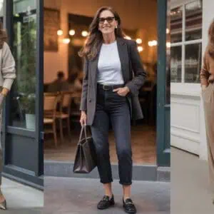 Channeling timeless elegance, a plaid wool coat is a classic staple that exudes confidence and sophistication. Its rich texture instantly elevates any look, making it a perfect choice for transitional weather. This coat layered over a simple grey sweater strikes the right balance between cozy and polished, ensuring you feel chic even on casual outings. Black slim-fit trousers anchor the outfit while creating a sleek silhouette. A pop of color with a burgundy clutch adds personality without overwhelming the look. With classic beige loafers, you can enjoy all-day comfort, making this ensemble as functional as it is stylish. This combination effortlessly showcases your individuality while embracing age with grace.