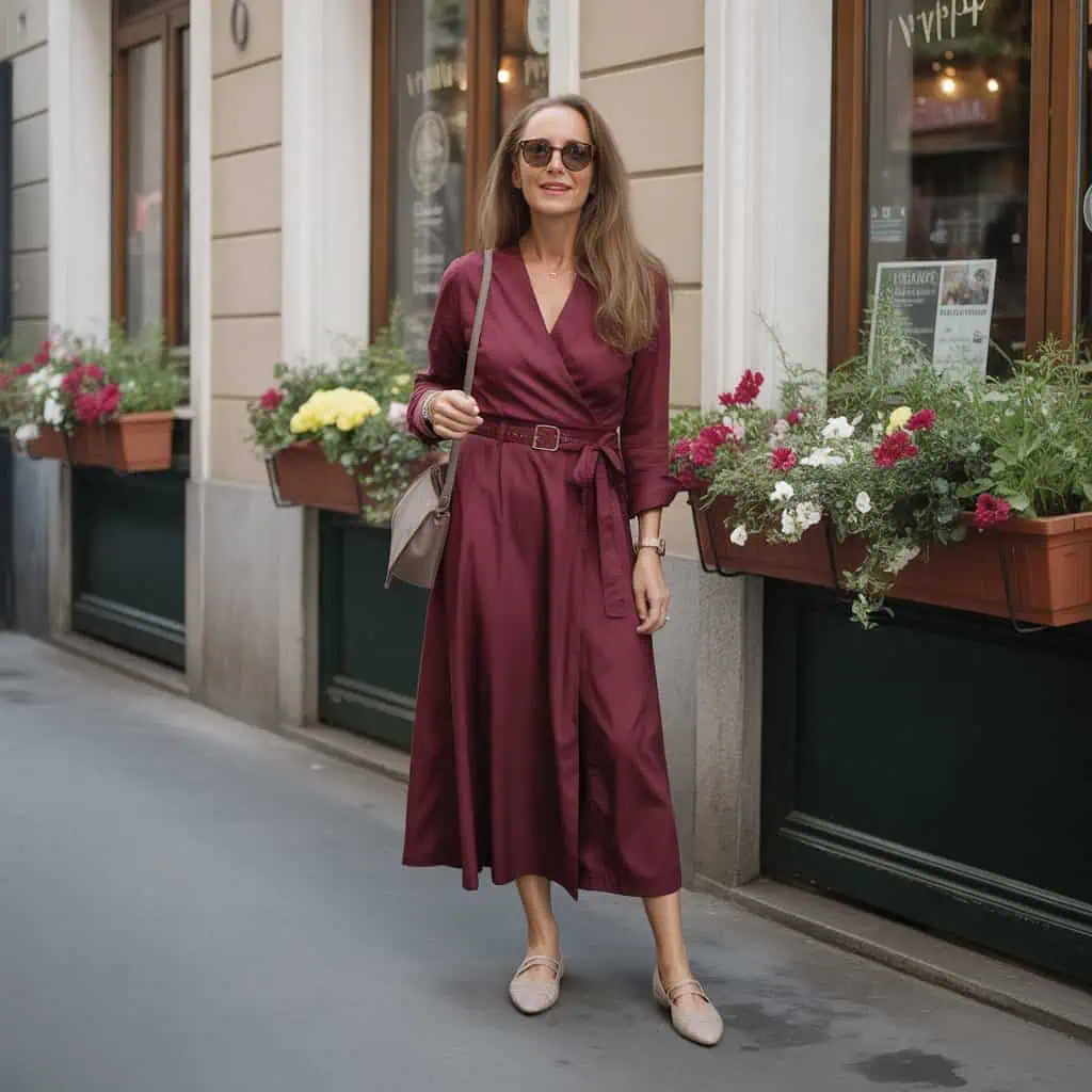 A wrap dress is a celebrated staple among Italian women over 50, effortlessly accentuating the waist while allowing for movement and comfort. In a rich burgundy hue, this style enhances warmth, mirroring the beautiful hues of fall. The cinched waist draws attention, contributing a flattering silhouette that suits various body shapes. Pairing this look with nude slingback flats keeps it relaxed yet polished, ideal for a leisurely day out. An oversized pair of sunglasses and a crossbody bag add to the effortless sophistication, making it a harmonious blend of style and ease perfect for a casual day or festive occasion.