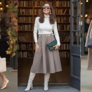 For an effortlessly chic vibe, a luxurious silk blouse paired with flowing wide-leg trousers hits all the right notes. The soft cream hue of the blouse brings a touch of femininity and warmth, while the wide-leg trousers offer a relaxed yet polished silhouette that’s perfect for events where comfort is key. The fluidity of the fabric creates an aura of movement, enhancing the overall sophisticated appeal. Adding pearl drop earrings introduces a classic elegance, and a structured leather tote completes the look, keeping it modern and functional. Together, these pieces exude confidence and style, making it a go-to choice for sophisticated gatherings.