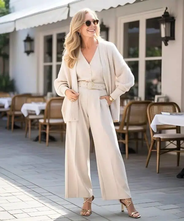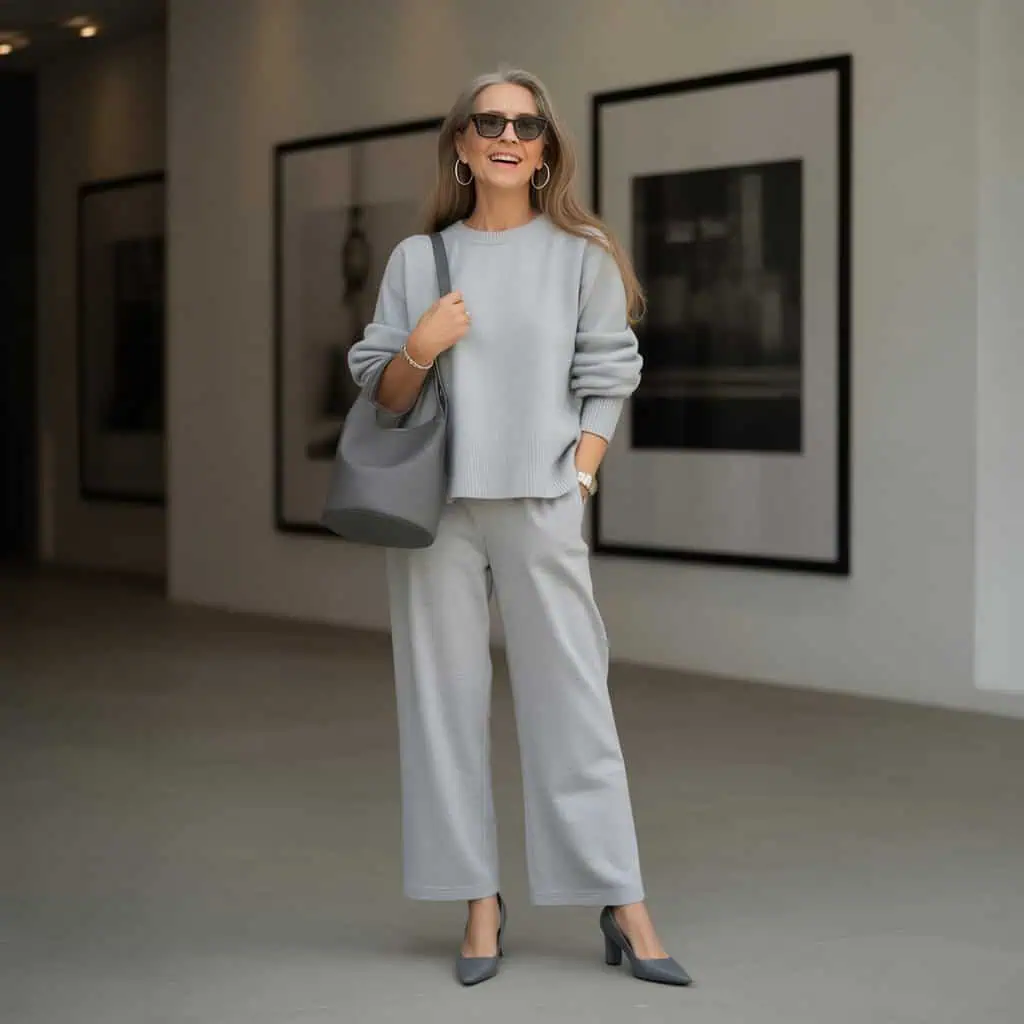 The beauty of a monochrome ensemble lies in its ability to create an elongated and sophisticated silhouette, perfect for women over 60 who want to project confidence and elegance. By embracing varying shades of a single color, like soft gray in this case, you can effortlessly streamline your look while adding subtle depth with textures and layers. Tucking in a soft knit top accentuates the waist, offering a tailored appearance that’s both flattering and comfortable. Utilizing accessories in complementary hues, such as charcoal bags and minimal silver jewelry, can enhance the cohesion of the outfit, leading to a polished, modern look that radiates both warmth and style.