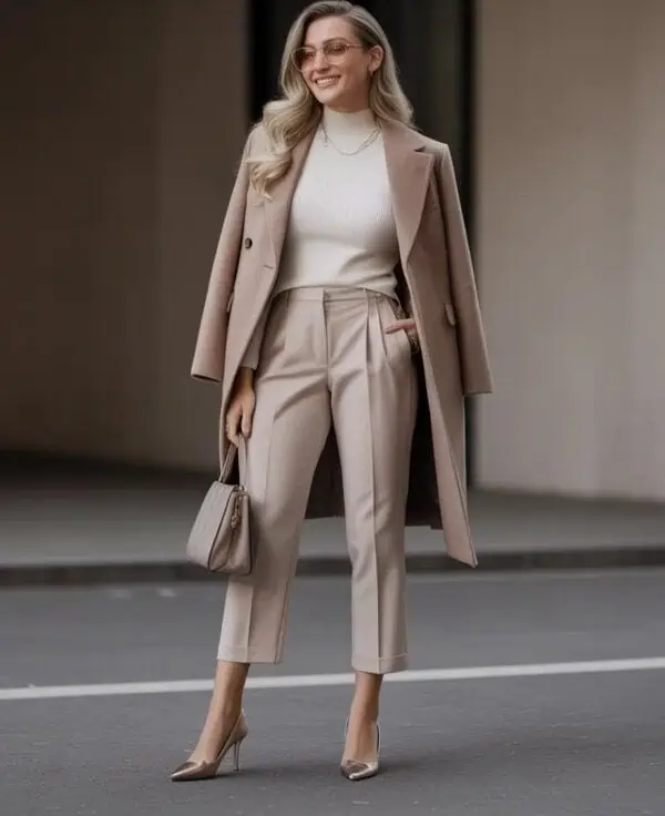 Monochromatic dressing in soft creams, ivories, and warm neutrals adds instant sophistication. Women over 50 love this trend because it brightens the complexion, softens features, and creates a luxurious, cohesive look without effort. Cream on cream outfits also look intentionally styled, even when built from simple basics. The key to making this trend work is mixing textures knitwear, wool, denim, or silk so the outfit feels dimensional rather than flat. It’s polished, timeless, and universally flattering.