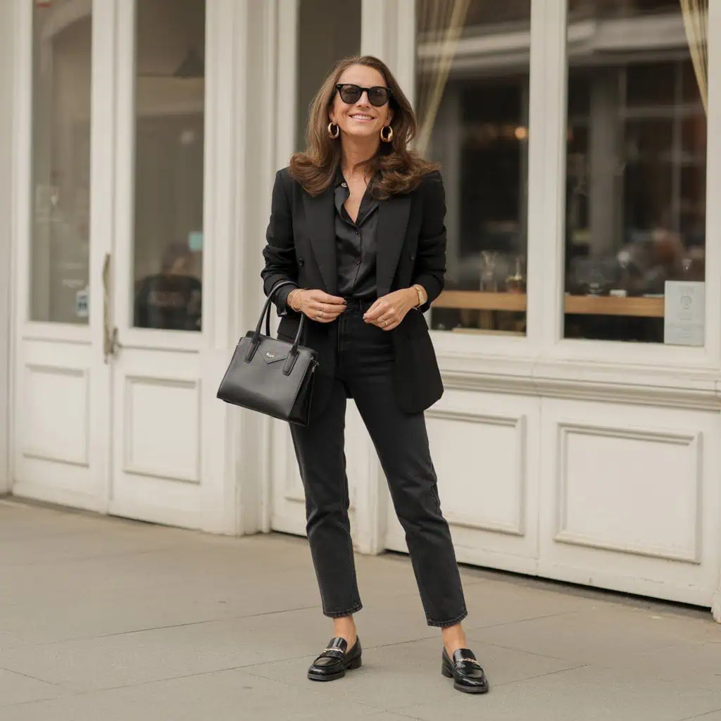 Pairing a tailored blazer with straight jeans creates a stunning juxtaposition of polished and casual, redefining smart-casual elegance. The tailored blazer amps up the sophistication, making it perfect for meetings or brunches, while the straight jeans offer the essential comfort we crave. Black leather loafers complete this ensemble with an understated, chic vibe, echoing the sharp lines of the blazer. Adding delicate gold jewelry introduces a hint of glam without overwhelming the look. Throw on oversized sunglasses for an effortlessly cool appeal, and you’ve got a look that transitions from day to night seamlessly, exuding confidence at every angle.