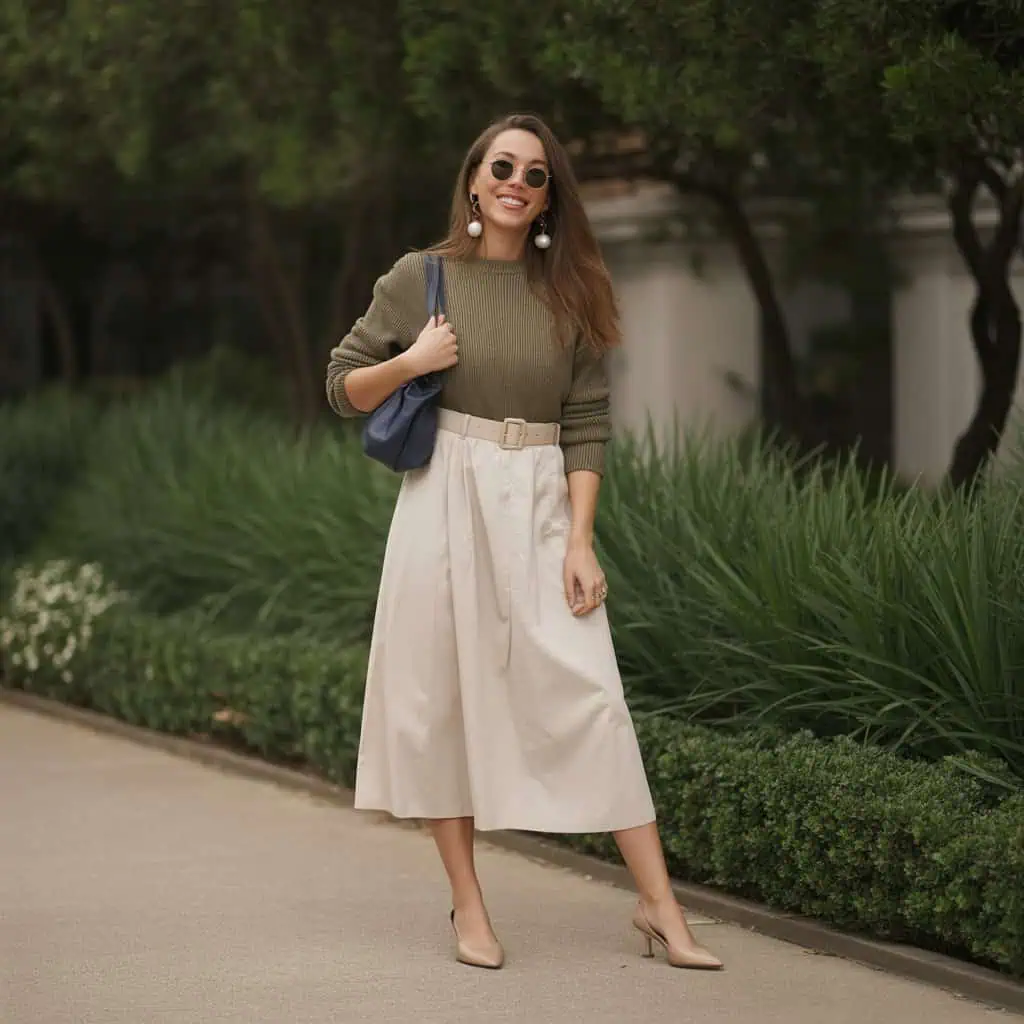Warm and inviting, this combo pairs a chunky knit sweater with a flowy midi skirt for an effortlessly appealing look. The olive hue of the sweater beautifully contrasts with the creamy tones of the skirt, creating a harmonious palette that’s perfect for a busy workweek. By tucking the sweater slightly into the waistband, you maintain definition and draw attention to your silhouette, making it both relaxed yet refined. Nude heels not only enhance the feminine feel but also add a touch of sophistication. Pairing this look with a blue handbag and sunglasses elevates the vibe, transforming a cozy outfit into a polished statement suitable for any Monday.