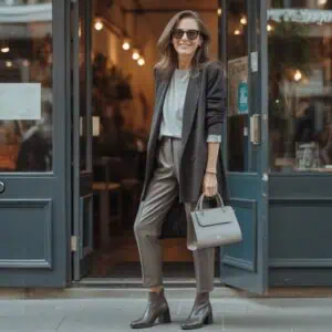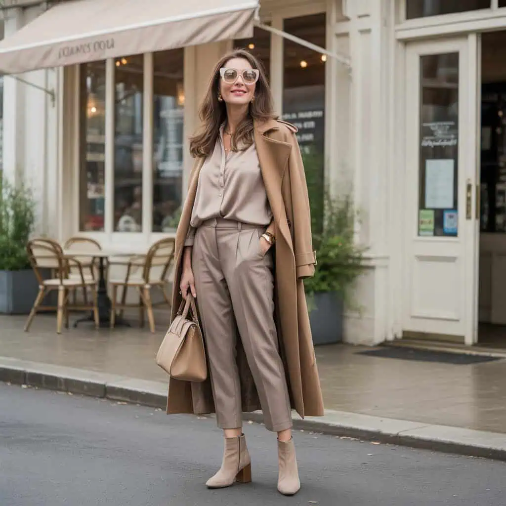 Wearing shades of taupe in a single outfit creates a soft and harmonious vibe that radiates sophistication. A tailored taupe blouse paired with fitted pants ensures a flattering fit that can elongate the figure. The trench coat, an essential layering piece, adds an air of elegance while providing structure to the ensemble. The addition of beige suede ankle boots ties the outfit together nicely, ensuring a comfortable yet chic finish. With a structured handbag and minimal gold jewelry, there’s just enough embellishment to catch the eye without overwhelming the outfit, making it perfect for stylish outings.