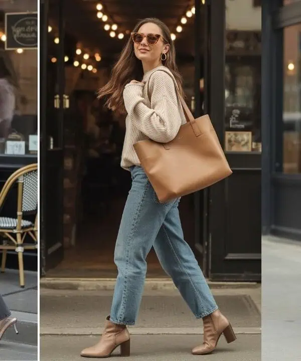 The sleek camel coat is a winter staple that effortlessly elevates any outfit. In this ensemble, the warm tones of the camel wool create a luxurious vibe, while the light cream turtleneck and wide-leg trousers provide a beautiful contrast that keeps the outfit light and airy. The tan ankle boots further enhance the chic aesthetic, creating a seamless color palette that feels rich yet understated. Accenting this look with a structured brown tote adds a touch of sophistication without overshadowing the coat’s elegance. This outfit captures the essence of contemporary luxury, making it perfect for brunch dates or casual meetings.
