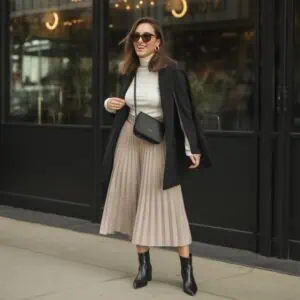 Black is often used as a protective uniform, but wearing it head to toe without structure removes dimension from the body. Stylists notice that matte black absorbs light and erases shape, which can drain vitality from the face and posture. When black pieces are loose, unstructured, and layered together, the result feels heavy rather than elegant. This look often stems from a desire to appear slim or understated, but it usually communicates withdrawal. Black works beautifully when balanced with texture, tailoring, or contrast near the face. Without those elements, the outfit lacks energy and modernity.