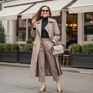 In fall especially, your coat is often the first (and sometimes only) part of your outfit others see. Choosing outerwear that is sleek, structured, and well-fitted instantly establishes authority. Trench coats, tailored wool coats, or belted wrap styles project sophistication far better than bulky, shapeless jackets. Many of my clients share that when they invest in elevated outerwear, they feel more confident walking into any social or professional situation. Outerwear frames your outfit and sets the tone it communicates polish before you’ve even removed it. Choosing coats with clean lines is a surefire way to project presence.
