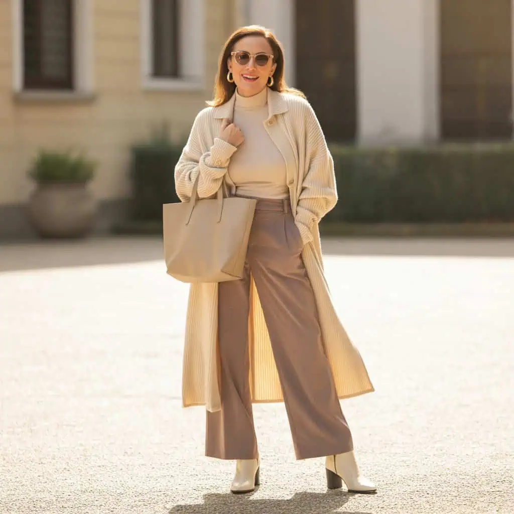 A perfect balance of casual elegance, this outfit pairs relaxed trousers with a fitted knit to accentuate the body’s natural shape while offering comfort. The slightly loose fit of the trousers creates a laid-back vibe that contrasts beautifully with the tailored look of the fitted top. This juxtaposition not only flatters but also highlights one’s silhouette, avoiding any frumpiness. The choice of white sneakers adds a modern touch, grounding the ensemble and making it practical for daily adventures. Neutral tones like beige and cream keep the focus on the wearer, enhancing their natural glow without overwhelming the viewer.