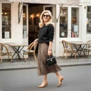 The midi A-line skirt is a timeless staple that offers an elegant silhouette suitable for any occasion. This style flatters various body types, as its shape gently skims over the hips and tapers down to a flowing hemline, creating a graceful look. Tucking in a fitted turtleneck adds definition and highlights your waist, while a belt cinches the outfit together, ensuring a polished finish. Pair this ensemble with ballet flats for comfort without sacrificing style. Throw in a crossbody bag for practicality, oversized sunglasses for a touch of flair, and minimal jewelry to maintain a chic yet effortless vibe.