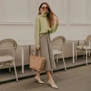 Houndstooth is a classic pattern that bridges timeless elegance with modern sophistication, making it a staple in any wardrobe. The fitted blazer gives structure to the ensemble, while the black turtleneck serves as a chic canvas that allows the houndstooth print to take center stage. A pair of tailored trousers keeps the look polished and helps elongate the silhouette. By grounding the outfit with black block heels, you create a streamlined finish. Oversized square sunglasses add a dash of drama, while the structured tote provides functionality without sacrificing style. This ensemble offers a perfect balance between professional and playful, ideal for making a statement anywhere you go.