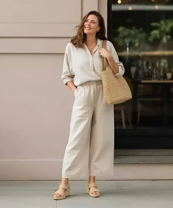 Dressing in monochrome is an easy way to appear polished without the fuss of matching multiple colors. Choosing neutral tones creates a sophisticated palette that is inherently chic. The wide-leg trousers paired with a knit turtleneck strike a fabulous balance between comfort and style, perfect for both casual gatherings and more formal occasions. A simple leather belt can also cinch the waist, adding subtle structure and dimension. Tan loafers extend the leg line, while a beige tote keeps the look cohesive. Complementing the outfit with gold hoop earrings and slim black sunglasses introduces a modern twist, ensuring you radiate confidence and ease during the holiday season.