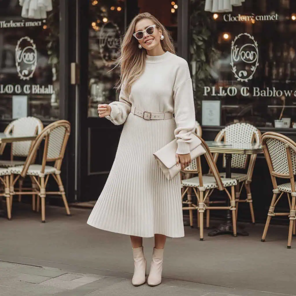 Opting for a ribbed knit midi dress is a brilliant choice for a cozy yet refined holiday look. The soft, beige fabric creates a warm and inviting aesthetic, allowing for versatility in layering or accessorizing. The midi length strikes a balance between comfort and sophistication, making it ideal for a variety of gatherings, while boots give a nod to practicality without sacrificing style. Pairing this cozy piece with a clutch creates an effortless look, while chunky gold earrings add a fun touch of sparkle. This ensemble feels approachable and chic, capturing the essence of understated holiday glamour.