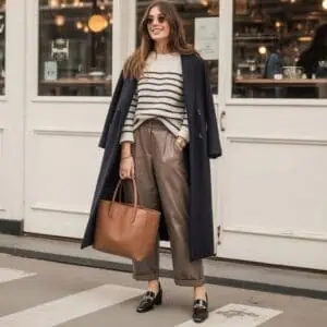 Layering a long coat over a structured blazer instantly elevates your outfit to a level of chic sophistication. This combination harnesses the contrasting styles of tailored and relaxed, creating a unique look that exudes confidence. The double-breasted blazer adds sharp lines, while the draped coat brings a sense of ease and effortless grace. Pairing this ensemble with high-waisted denim trousers ensures a flattering silhouette, elongating your legs and providing a perfect canvas for your sleek loafers. Don’t forget to accessorize with a stylish tote and a silk scarf tied to it, as they bring a touch of personal flair, making a statement without overshadowing the outfit.