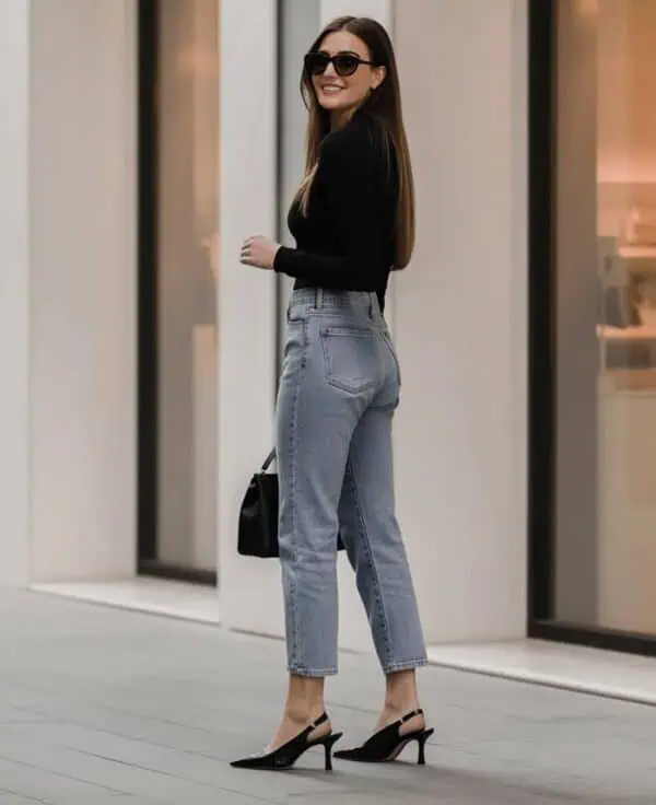 Achieve a timeless look with a cream turtleneck paired with navy pull-on trousers. This chic ensemble strikes the perfect balance between comfort and sophistication, making it a standout choice for travel. A fitted turtleneck is not only warm but also flattering, creating a sleek canvas for your look. Navy pull-on trousers add a modern touch and provide exceptional comfort with their elastic waistband—ideal for long flights. Complete the outfit with black sneakers for ease of wear and practical movement. Pearl earrings and tortoiseshell sunglasses elevate the entire look, making you feel put together even when you’re running from gate to gate.