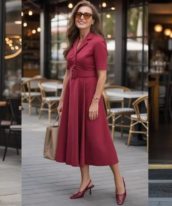 An alluring burgundy silk wrap dress flatters all figures while providing effortless elegance, making it an excellent choice for evening events. The wrap design draws attention to the waist, creating a beautifully feminine silhouette that’s timeless. Paired with gold strappy sandals, this look exudes a touch of glam that’s perfect for dancing the night away. The bold statement earrings add personality and draw attention to the face, while a jeweled clutch keeps it luxurious without trying too hard. Altogether, this outfit is a perfect blend of style and sophistication, showcasing confidence at any age.