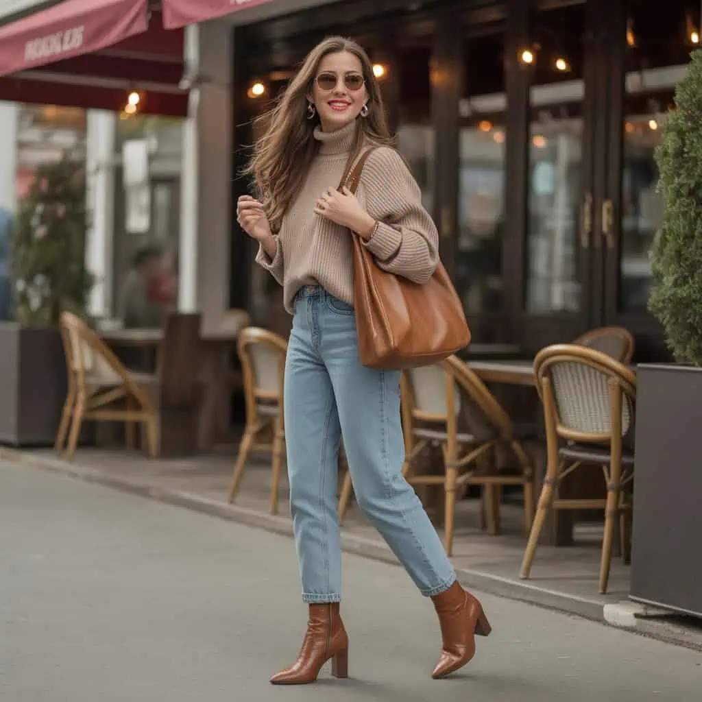 Combining a cashmere sweater with straight-leg jeans embodies casual elegance that’s hard to beat. The softness of cashmere is not only a cozy embrace on cooler days but also elevates your overall aesthetic from basic to luxe. Straight-leg jeans strike a perfect balance between tailored and relaxed, making them a versatile choice that flatters a variety of body shapes. This pairing allows you to play with layers and textures—try a long coatigan to amp up the style quotient. With the right accessories like a chic brown bag and understated jewelry, you achieve a fresh, refined look that remains polished yet relaxed, making it suitable for a range of occasions.