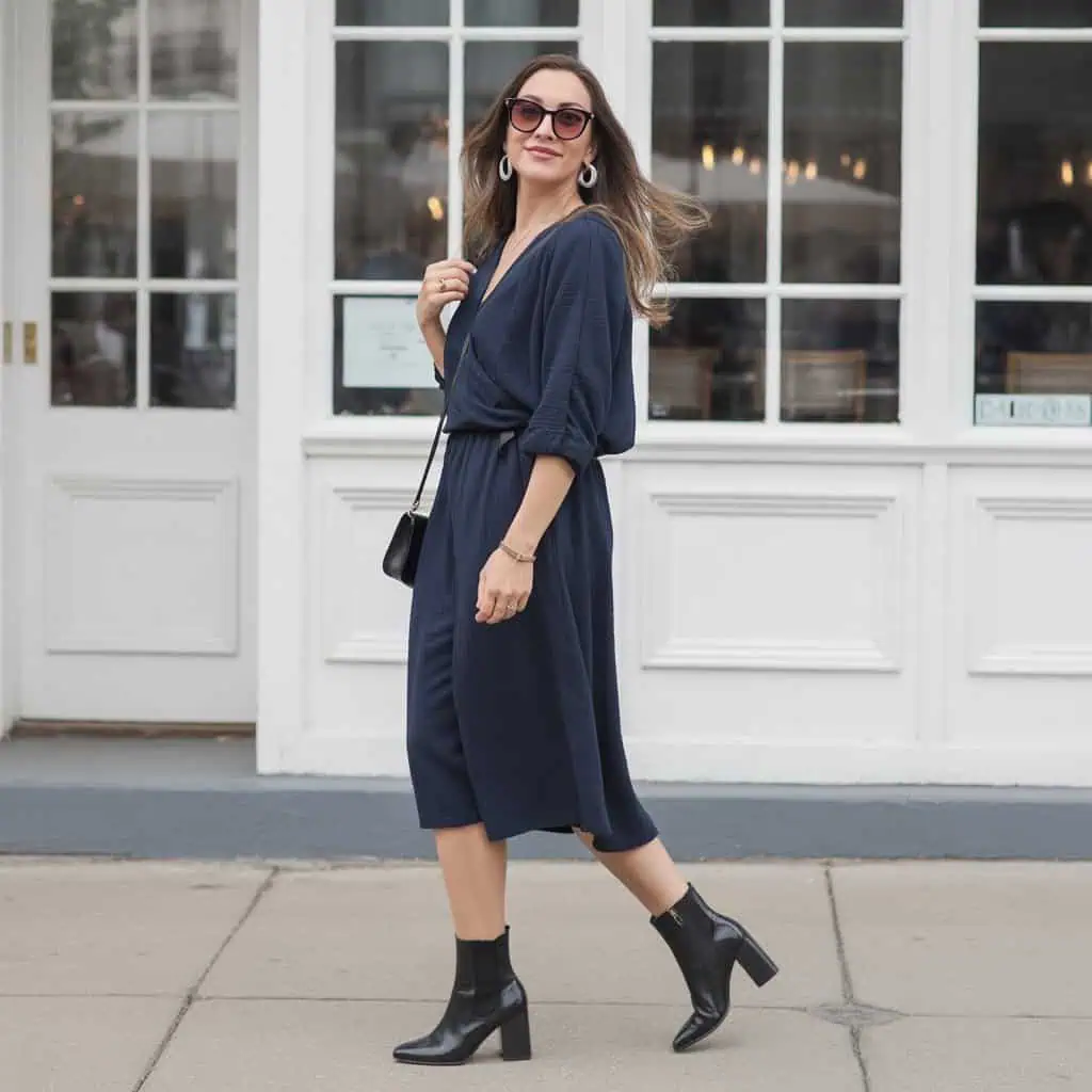 A wrap dress is an enduring staple, celebrated for its effortless femininity and flattering fit. Choose a solid navy hue for a stunningly versatile piece that can be dressed up or down. The cinched waist not only enhances your silhouette but lends an air of elegance, making it appropriate for numerous occasions. Pairing it with ankle boots adds a modern edge while keeping comfort in mind, perfect for those long brunch dates or casual outings. Round sunglasses and a structured handbag introduce playful elements without overshadowing the outfit’s inherent sophistication. This blend of styles demonstrates how a classic piece can adapt with a contemporary twist.