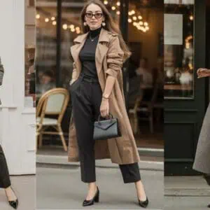 Embrace the elegance of autumn with a warm camel wrap coat draped over a fitted black turtleneck, a combo that exudes both warmth and style. The wrap coat’s tailored silhouette accentuates the waist, while the darkness of the leggings provides a sleek backdrop for the rich tones of fall. Tall leather boots add a touch of chic sophistication and keep your look grounded and practical. To enhance this ensemble, statement sunglasses and chunky gold earrings inject some personality, making it an ideal outfit for a day of shopping or brunch with friends, all while staying cozy.