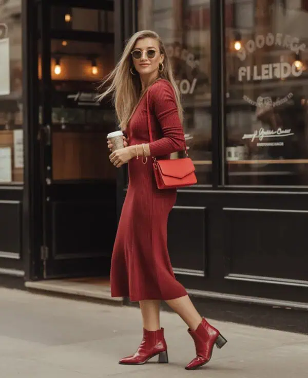 The turtleneck is a classic piece that captures elegance while keeping you toasty, making it a quintessential early winter item. When styled with a flowy midi skirt, you get an effortless juxtaposition of structured and soft; the fitted top complements the skirt’s movement beautifully, enhancing your silhouette. Black ankle boots ground the outfit, providing a chic edge that pairs perfectly with the romantic vibes of a midi length. Accessorizing with pearl earrings and round sunglasses adds a touch of sophistication, making this combo ideal for a dinner out or festive gatherings. It’s an outfit that exudes confidence and charm in any setting.