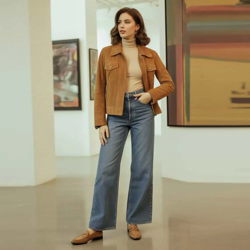 Nothing says ’70s chic quite like suede, a texture that elevates any outfit with its rich, tactile quality. Opting for a tan suede jacket brings warmth and sophistication to a classic outfit, pairing beautifully with a simple turtleneck and high-waisted jeans. This combination not only flatters your shape but also highlights the dynamic between rugged and refined. Slip on some loafers for a hint of elegance, adding a touch of versatility that lets you go from day to night effortlessly. The beauty of this look is in its simplicity punctuated by luxurious materials, ensuring you stand out in any setting.