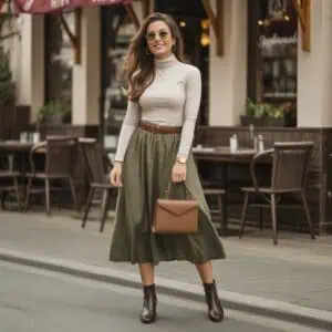 Opting for a fitted turtleneck paired with a flowing midi skirt is a fantastic way to navigate fluctuating temperatures with flair. The turtleneck hugs the body, providing warmth and comfort, while the airy midi skirt adds a touch of femininity that can sway softly in the breeze. Black leather ankle boots offer the perfect finishing touch, adding a hint of edge that harmonizes beautifully with the outfit’s elegance. Complete the look with statement accessories like oversized sunglasses and a sleek crossbody bag, ensuring you’re both practical and chic, ready to tackle anything the day may throw your way.