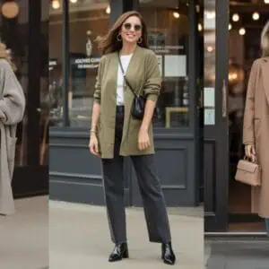 A structured handbag is the epitome of sophistication, offering an immediate upgrade to any outfit. This fall, pairing a beautifully crafted leather handbag with a tailored camel blazer showcases a polished aesthetic that commands attention. A cream blouse beneath adds a fresh brightness and counterbalances the dark brown block-heel shoes flawlessly. By opting for straight-leg grey trousers, you’re creating a streamlined look that’s both professional and stylish. Layering necklaces adds a personal touch without overwhelming the visual appeal. This outfit embodies a refined elegance that transitions seamlessly from day to night, proving that timeless style never goes out of fashion.